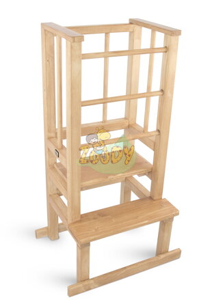 Polohovatelná učící věž Zebra je určena pro všechny malé nezbedy. Díky svislým tyčkám na přední straně a na bocích zabrání tomu, aby na ni děťátko vylézalo a podpůrné nohy zabraňují kývání do stran.