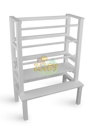 Polohovatelná učící věž roste s vaším dítětem. Má tři polohy, které přizpůsobíte jeho výšce. Pro nejmenší děti je určena vrchní poloha ve výšce 50 cm, střední poloha je určena pro děti do 4 let ve výši 37,5cm a nejnižší poloha je pro starší pomocníků je ve výšce 25 cm. V případě sourozenců s věkovým rozdílem, doporučujeme přizpůsobovat výšku staršímu z dětí.