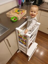 Učící věž je chytrý kus nábytku, kde dítě stojí bezpečně v sympatické výšce u pracovního stolu, a vy nemusíte mít permanentně jednu ruku za jeho zády. Navíc si tam dítě samo pohodlně vyleze po schůdcích a ušetří vaše záda.
